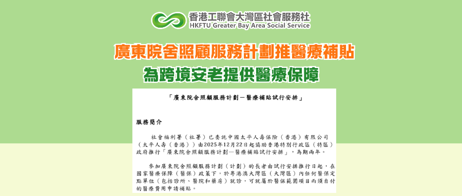社會福利署(社署)宣布,已委託中國太平人壽保險(香港)有限公司(太平人壽(香港))由2025年12月22日起協助香港特別行政區(特區)政府推行廣東院舍照顧服務計劃——醫療補貼試行安排,為期兩年。