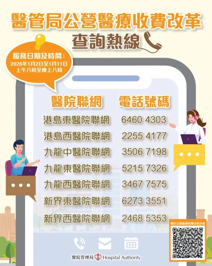 醫管局會密切監察各醫院的運作情況,同時亦提醒病人,隨着新收費安排(附件)正式推行,部分醫療服務的流程亦有轉變,各醫院聯網已設立查詢熱線(詳見下圖),供病人查詢收費改革的各項安排,病人亦可瀏覽醫管局網頁查閱相關資訊。
