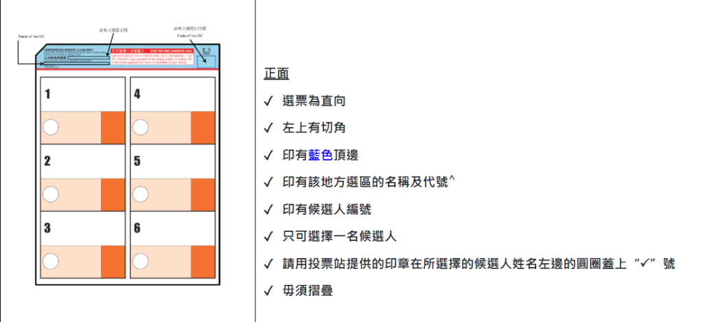 - 地方選區選民,在選票蓋上一個剔號(√),投選1名候選人。將選票已填劃的一面向下,無須對折,按指示放入指定投票箱