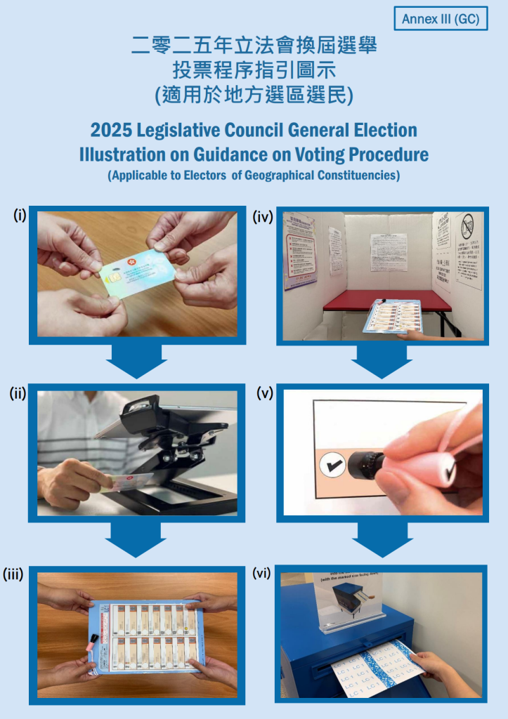 2025年立法會換屆選舉於12月7日(星期日)舉行,選民須按投票通知卡或經「智方便」得到的資訊,到指定投票站,出示身份證,經核實身份獲發選票。有需要人士(如年滿70歲長者、孕婦、殘疾人士等)可使用特別隊伍。