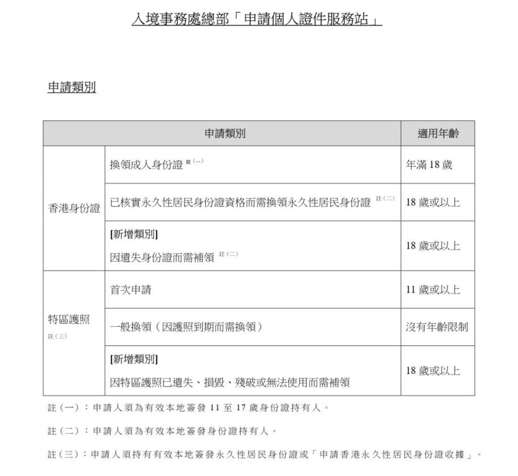 1. 持有11至17歲人士身份證並年滿18歲而需換領成人身份證人士的申請;以及