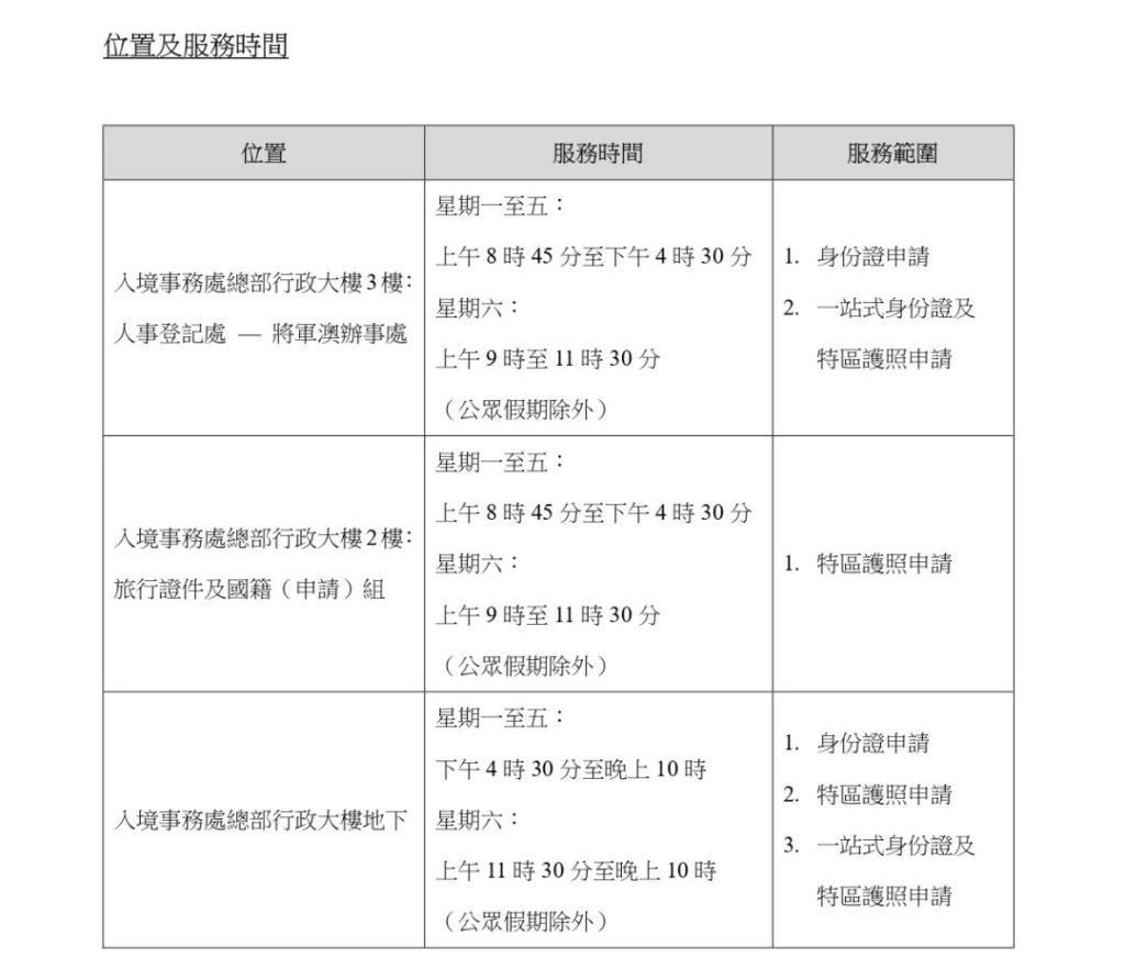 合資格申請人可選擇使用服務站一站式辦理身份證和特區護照的申請。服務站設於將軍澳入境處總部,有關服務站涵蓋的申請類別、位置及服務時間,請參閱下圖。